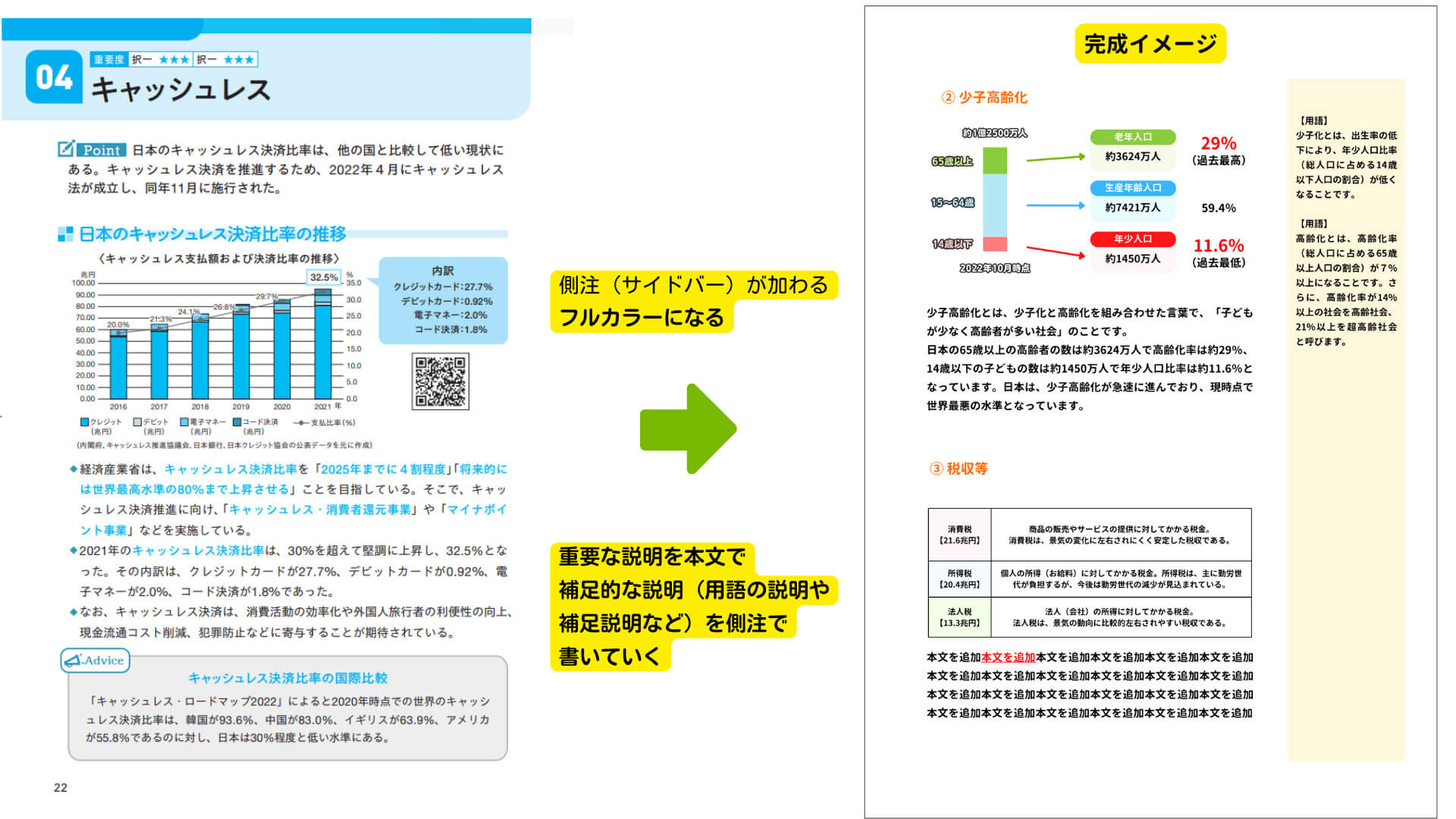 左はライトの昨年の書籍、右が新書籍になります。側注が加わることと、フルカラーになることが大きな変更点となります。