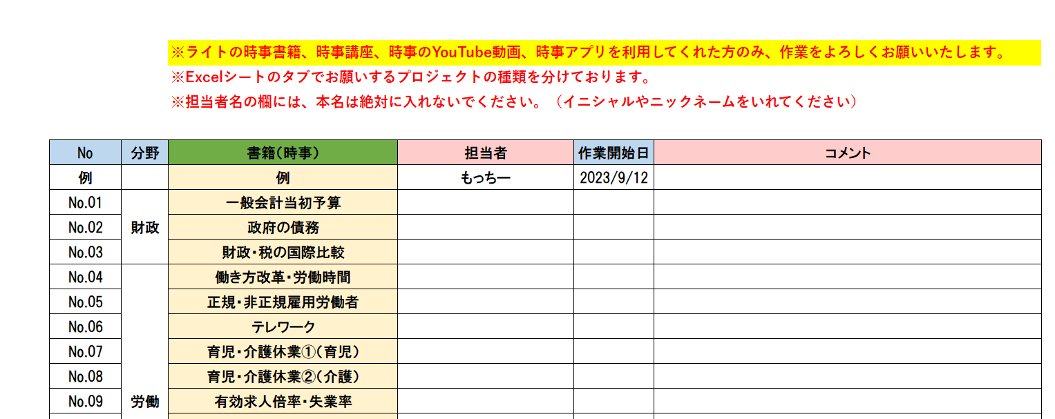 まず、アルバイト依頼完了シート(Excel)の方で、自分が作業する【時事テーマ(単元)】の欄にニックネーム等を入力してください。(※こちらはオンラインでの共有ファイルになるので、ダウンロードはせず、オンラインで開いてください。)