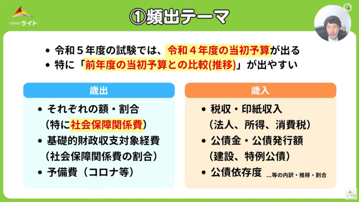 また、例えば、一般会計当初予算であれば、試験に出題されやすい箇所を小テーマとして分けて、それぞれわかりやすく図表等を用いて説明してください。以下、一般会計当初予算における頻出・重要テーマです。