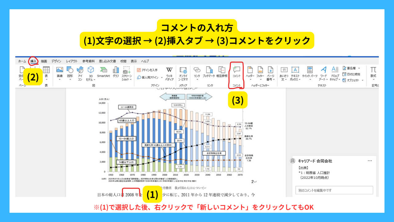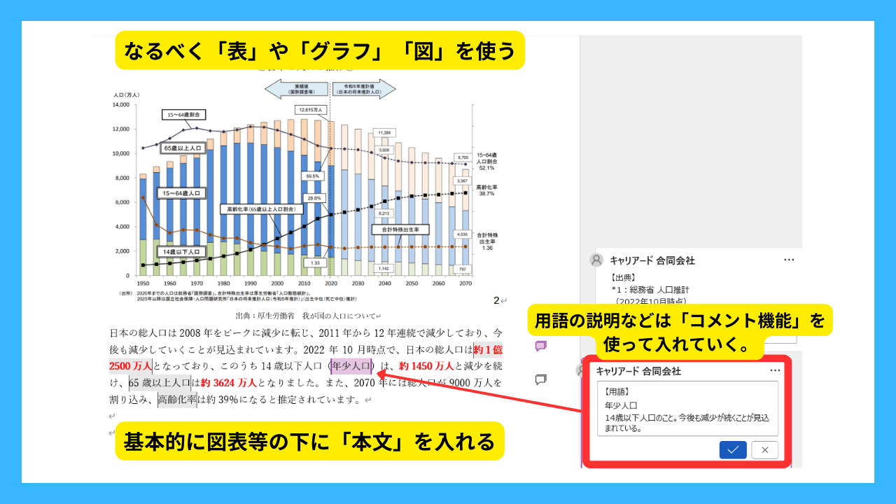 - 重要なキーワード(例、生産年齢人口)については、その定義や内容について、Wordのコメント機能を用いて分かりやすく説明してください(後ほど解説します)