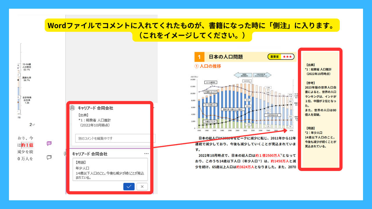 コメント機能で入れたものが、完成したときの書籍では「側注」に入るということをイメージして、本文はわかりやすく文章を簡潔に、「出典」や「用語の説明」など、細かい説明等は「側注」で補足していく形で原稿を作ってください。