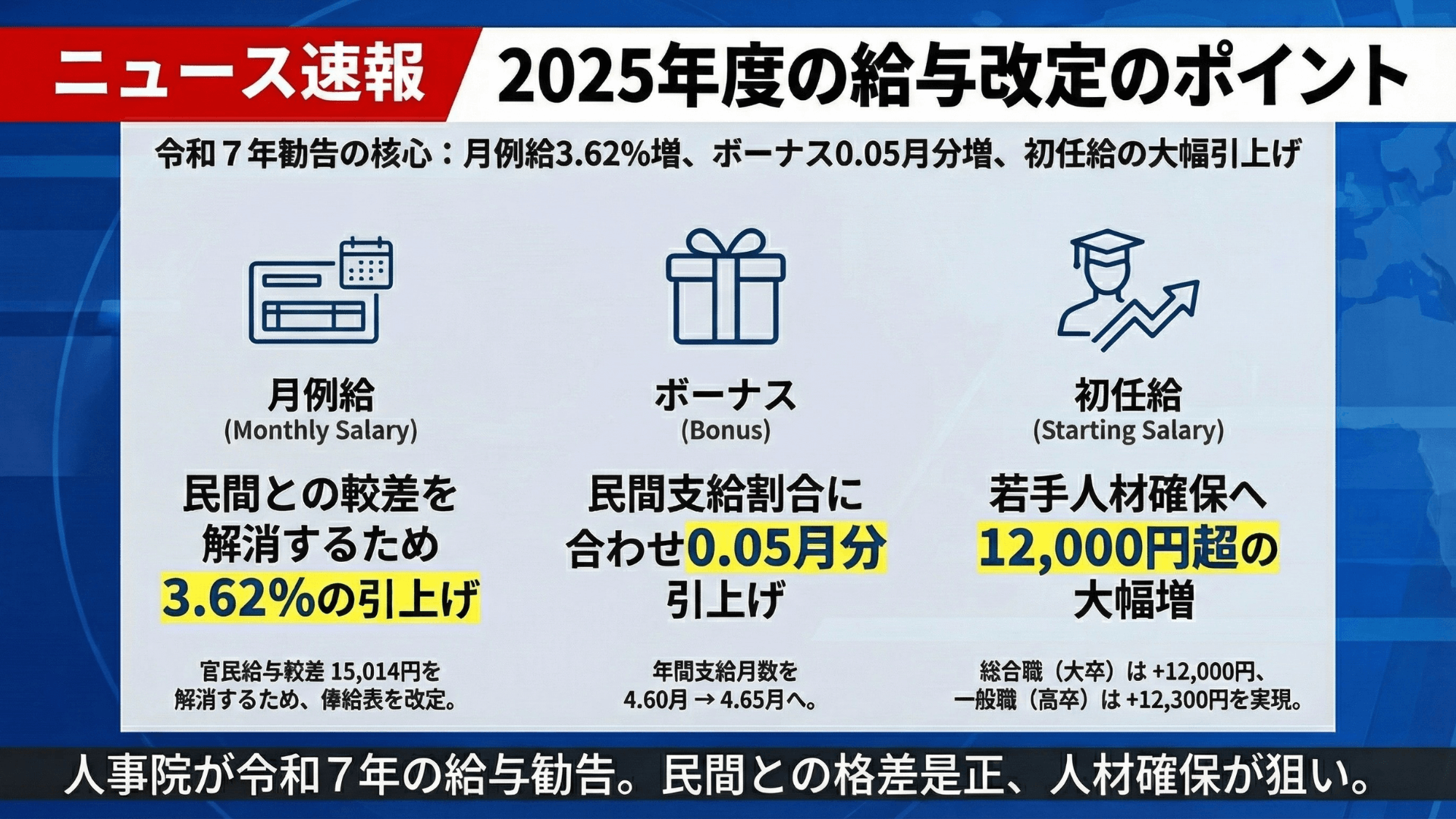 これから公務員を目指す方や、試験勉強中の方にとって、待遇面は非常に気になるポイントではないでしょうか。 この記事では、公務員予備校「公務員のライト」のニュース配信(2025年12月19日)をもとに、今回の給与改定の重要ポイントやその背景、具体的な年収イメージについて詳しく解説します。
