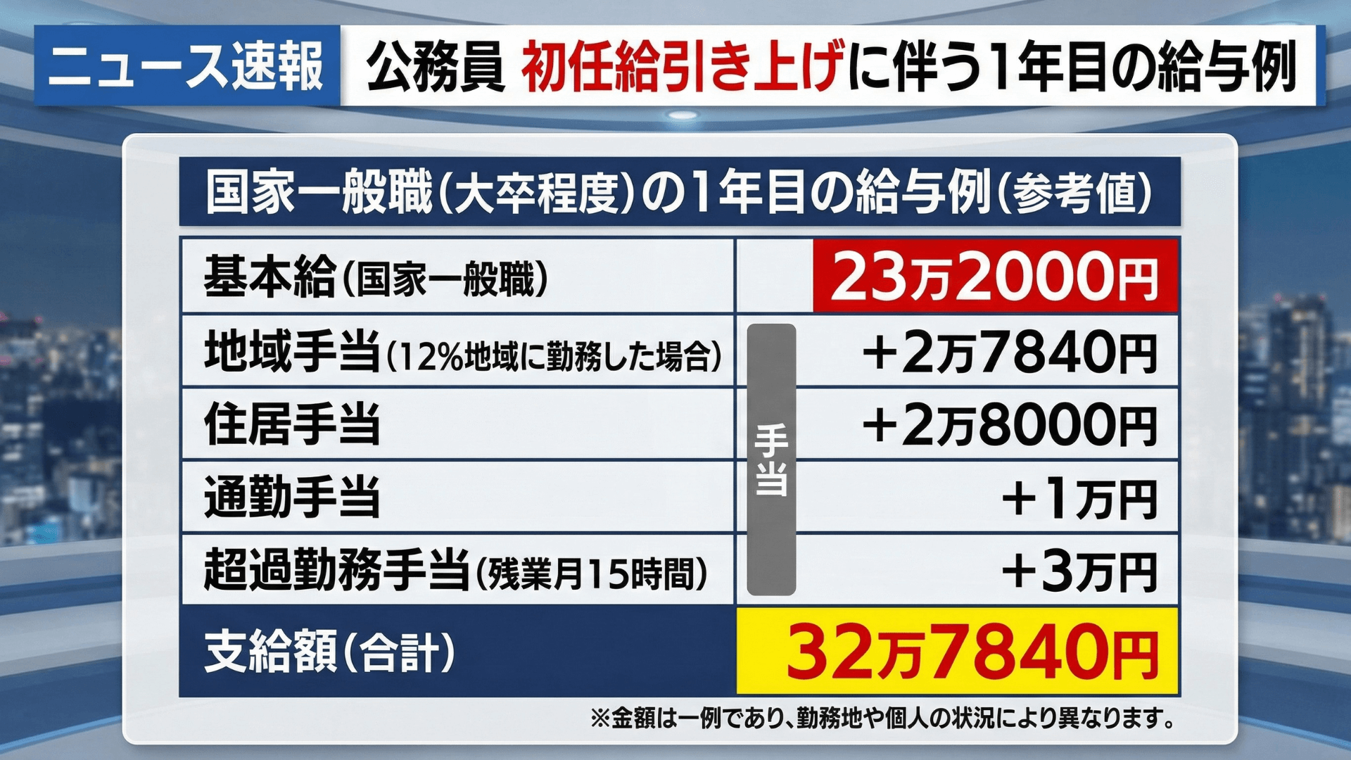 | 国家総合職(大卒) | 24.2万円 | +1.2万円 | 本府省勤務はさらに高待遇 |