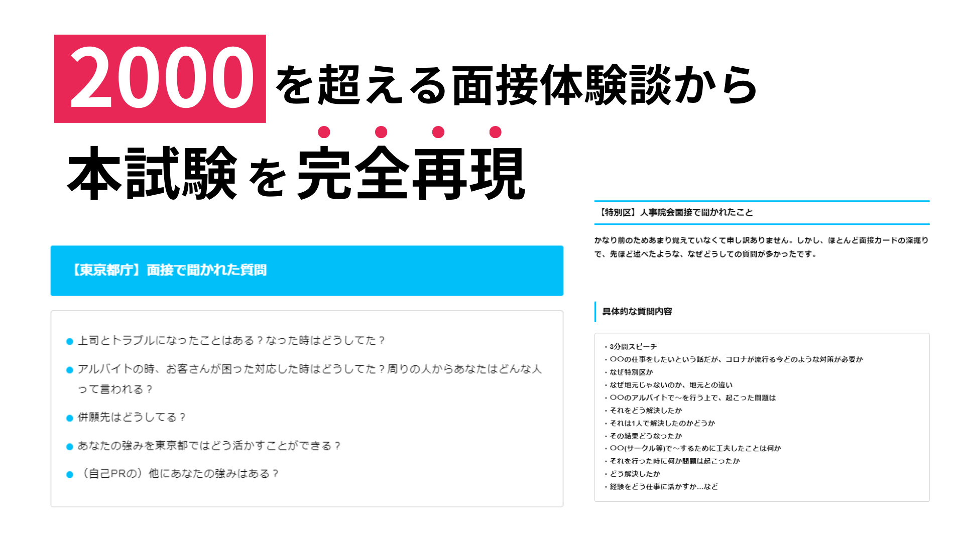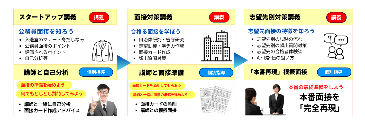 ①面接対策を重点的に行いたかったから。 ②自分の勉強法が正しいのかアドバイスをいただきたかったから。 ③1人で公務員試験を進めていくには心が折れてしまいそうであったため、サポートしてもらいながら進めたかったから。