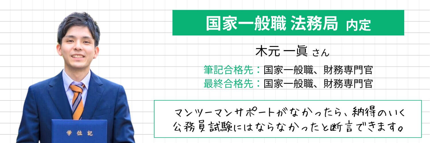 公務員試験は結果が出るまでとても長いので、長期間対策を行っていく中でモチベーションが低下したり、諦めそうになったり、直前期に模試の点数が悪くて不安になったりする事もたくさんありましたが、公務員のライトの講師がマンツーマンサポートで何度も励まして背中を押してくださったおかげで最後まで諦めずに合格を掴み取ることができました。 また自分の周りには公務員受験生がおらず、1人で対策をしないといけない状況だったのですが、公務員のライトの講師の方がマンツーマンでサポートしてくださったおかげで情報収集の面で困ることは一度もありませんでした。 情報戦の公務員試験でいろんな情報を得ることができるのはかなりアドバンテージになっていたと思います。 最後に、公務員のライトのマンツーマンサポートがなければ自分は公務員試験に合格することはできませんでした。 合格までサポートしていただき本当にありがとうございましました。 来年から公務員として頑張っていきたいと思います。