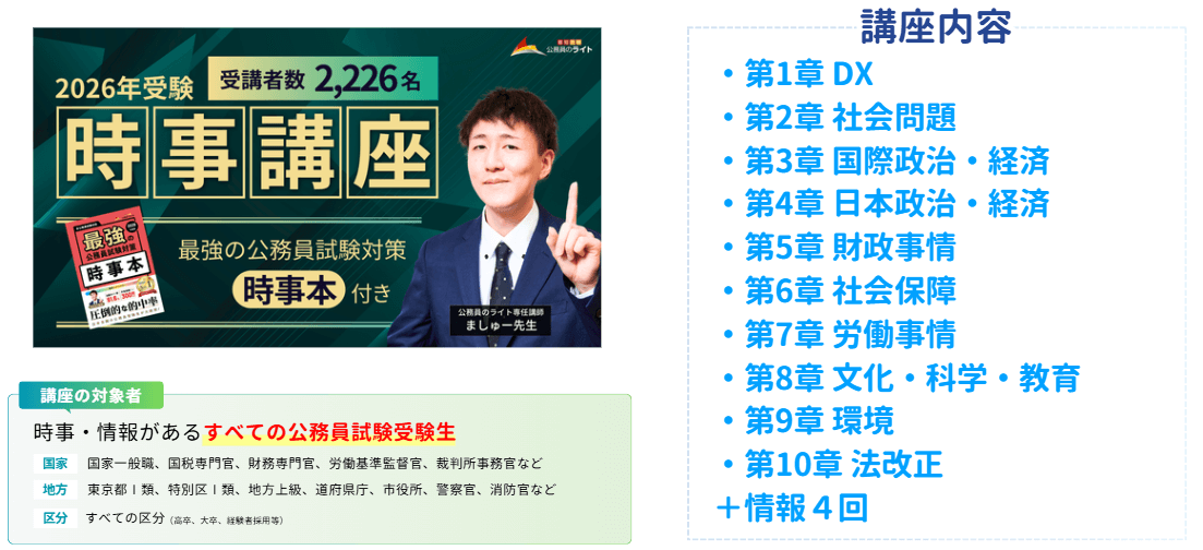 「時事」は、ほぼすべての試験で課されます。ですが「対策方法がわからず何から始めればよいかわからない」「参考書で対策したけど問題が解けない」受験生が多数います。ライトの講座であれば、「試験に出る分野に特化した対策で短期間で得点源」にできます。これまで2,000名以上の受講生から「国般や国税の時事で満点取れた」などご好評をいただいております。