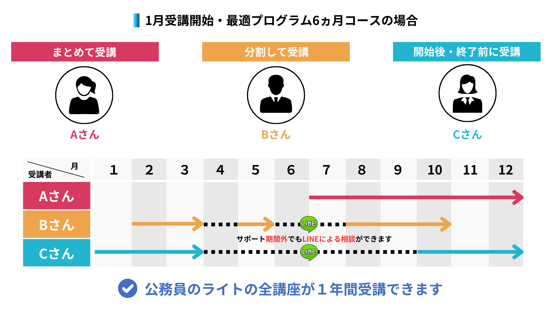 講座をご購入いただくと、担当者よりLINE公式アカウントを通じて「個別面談」のご案内が届きます。 この「個別面談」では、志望先や得意・不得意科目などをヒアリングし、あなたの目標に合わせたオリジナルの学習カリキュラムを、公務員のライトのプロ講師と一緒に作成していきます。 また、不安や悩みがある場合も、どんなことでもお気軽にご相談いただけます。