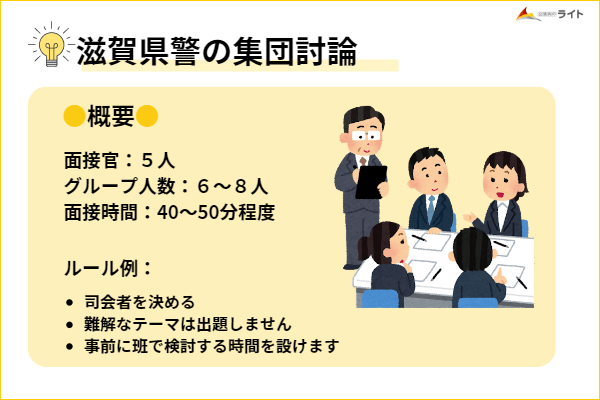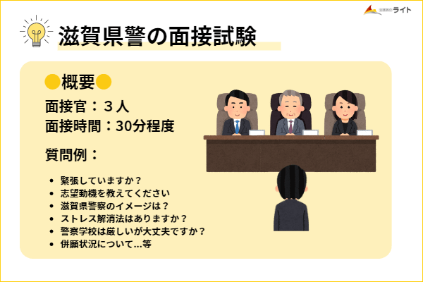 滋賀県警の面接試験は、面接官が3人、面接時間が30分程度となっており、面接官からの質問に答えていく試験です。