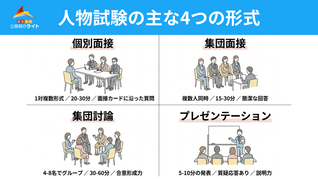 公務員試験の人物試験は、単なる質疑応答だけではありません。自治体により組み合わせは異なりますが、主に以下の4つの形式で実施されます。それぞれの具体的な進行イメージを解説します。