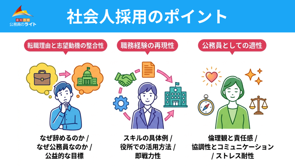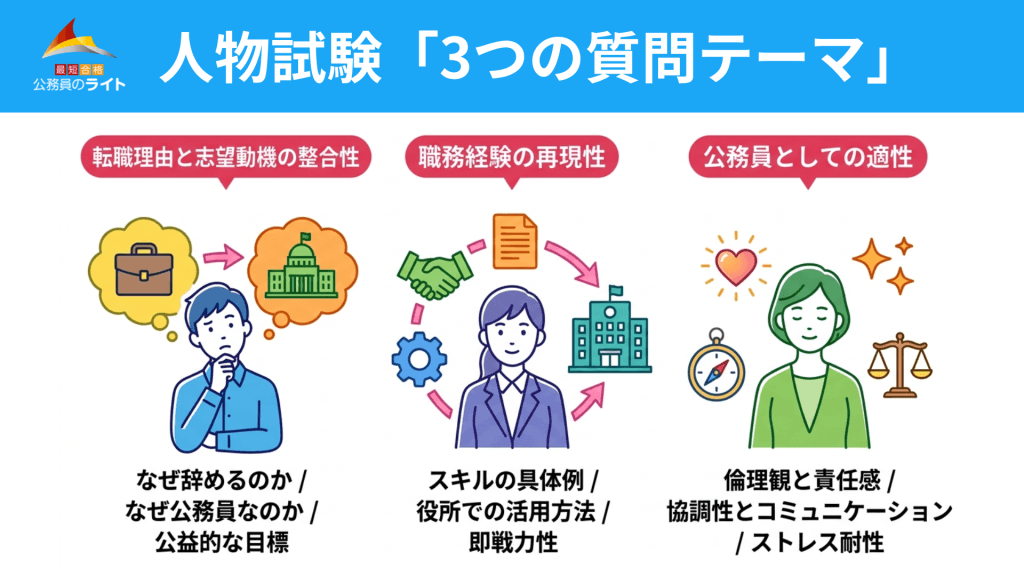「なぜ今の会社を辞めるのか」と「なぜ公務員なのか」の2点は必ずセットで問われます。