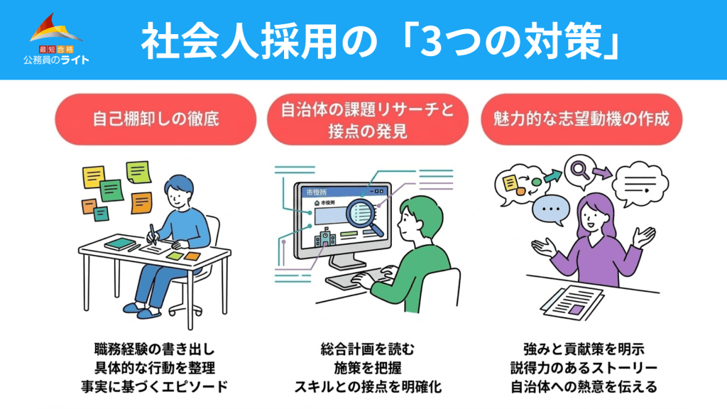 志望する自治体のホームページで「総合計画」や「広報誌」を読み込み、現在どのような施策に注力しているかを把握します。その上で、自分のスキルが自治体のどの業務で活かせるのか、接点(ブリッジング)を明確にしておきましょう。