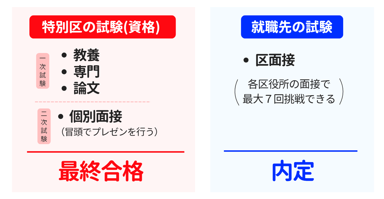 特別区の試験は、大きく分けて一次試験と二次試験、そしてその後の区面接で構成されています。