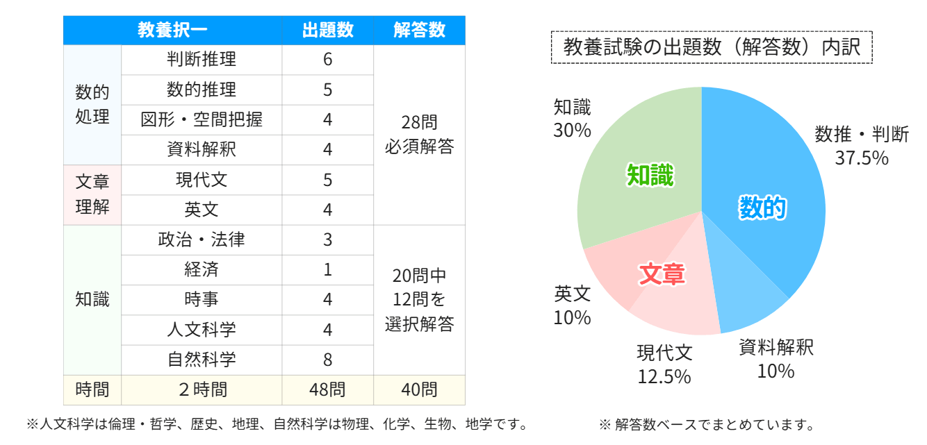 教養試験は持ち帰りのルール等が変わりましたが、「枠組み」自体が大きく変わるわけではありません。 教養択一は全40問解答で、内訳としては知能分野(数的処理や文章理解)が28問の必須解答、知識分野(人文科学や自然科学、時事など)が20問中12問の選択解答という形式です。
