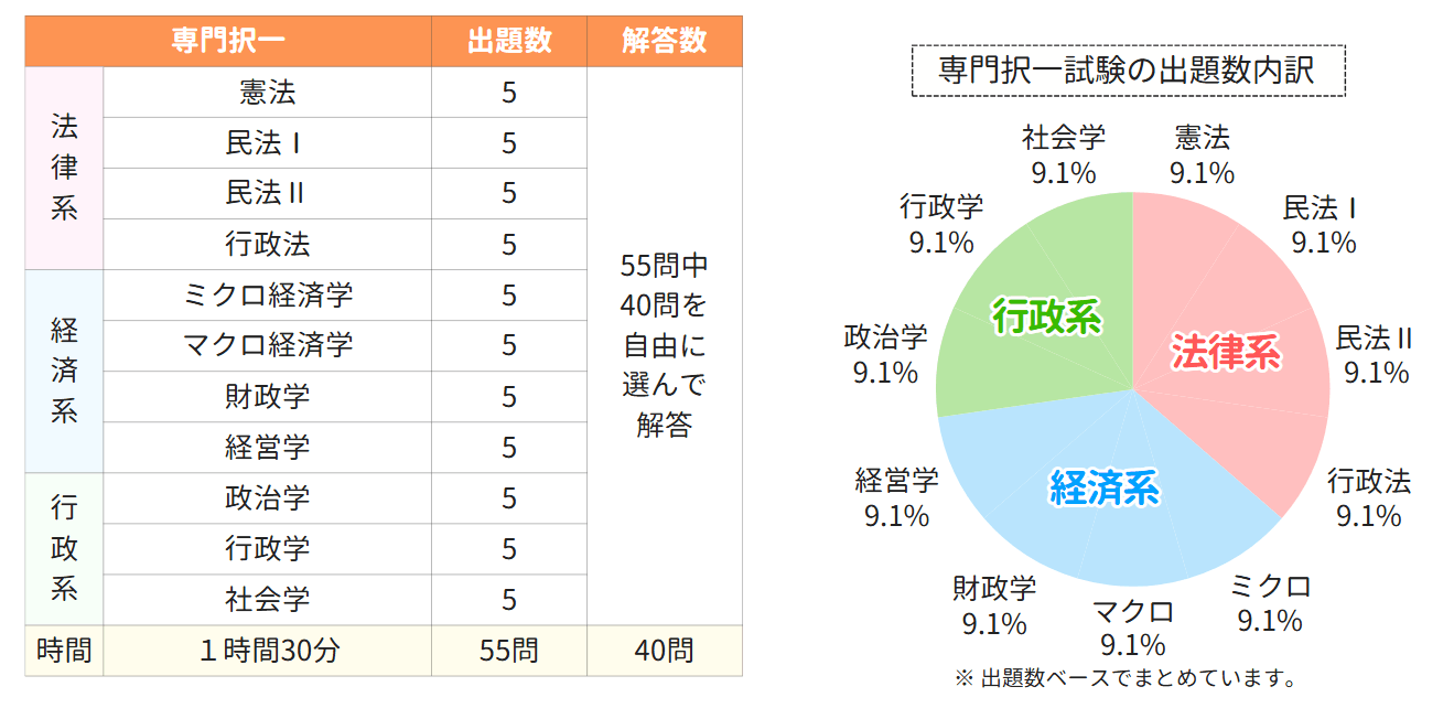 次に専門試験についてです。 こちらは55問中40問を選択して解答する形式で、憲法、民法、行政法、経済学などの主要科目が5問ずつ均等に出題されます。