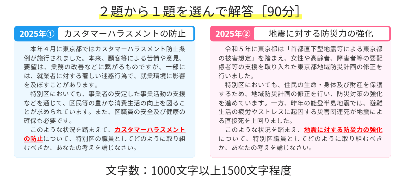 続いて、特別区の大きな関門である論文試験です。 90分で1000字以上1500字程度を記述するもので、2題から1題を選択する形式です。