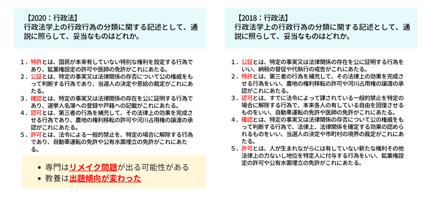 最後にまとめです。専門試験は、こちらの「行政法」の問題のように、過去の問題の選択肢を少し組み替えただけの「リメイク問題」が出題される可能性が十分にあります。専門は過去問の反復が王道です。